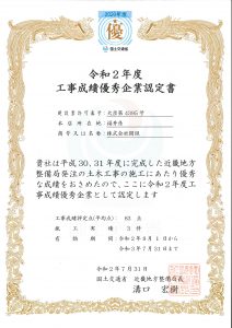 令和2年度工事成績優秀企業に認定されました 更新日:2024年8月20日2020年8月7日| 表彰・認定 7月31日に国土交通省 近畿地方整備局長より 「令和2年度 工事成績優秀企業認定書」を頂きました。 関組は、確かな技術力でこれからも高品質な施工をおこなってまいります。 (株)関組 総務部